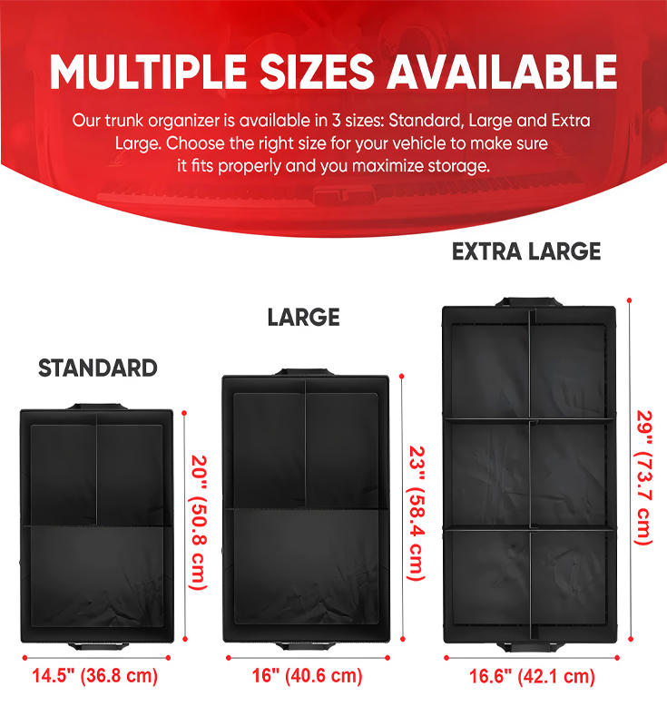 حقيبة تخزين صندوق السيارة هذه مع غطاء قابل للطي لشاحنات الدفع الرباعي وسيارات السيدان. يبلغ حجمه 57 × 33.5 × 29 سم، وهو ذو حجم متوسط ​​ويمكنه الاستفادة الكاملة من المساحة الداخلية لتلبية احتياجات التخزين المتنوعة. تزن حقيبة التخزين 1.8 كجم، وتستخدم قماش أكسفورد مع لوح PP أو لوح MDF. الغطاء الداخلي 210 د. المادة قوية ومتينة، مع دعم جيد ومقاومة للتآكل. يمكن لتصميم الغطاء أن يمنع الغبار بشكل فعال ويحمي خصوصية العناصر، مما يجعل تخزين العناصر في السيارة أكثر أناقة وتنظيمًا. علاوة على ذلك، فهي قابلة للطي ويمكن تخزينها بسهولة عند عدم الاستخدام، مما يوفر المساحة. يتم تعبئة المنتج في صندوق مكون من 5 قطع، وحجم الكرتون هو 38X32X35CM، وهو مناسب للشراء والتخزين بالجملة، وهو شيء عملي للتخزين في السيارة.